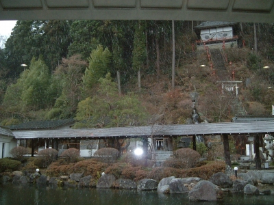 食事をしながら中庭を見ていたらそれまで良い天気だったのに大粒の雪が降ってきました。
