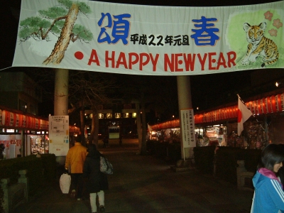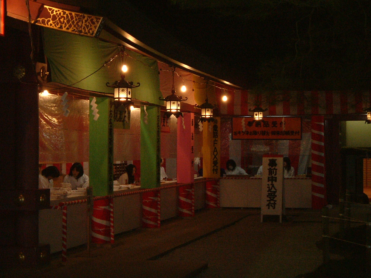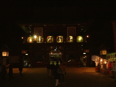 大晦日午後8時半頃の茨城県笠間市にある「笠間稲荷神社二の鳥居」前です。ここは日本三大稲荷のひとつ(他に京都伏見稲荷、佐賀佑徳神社)で商売繁盛の新年初祈祷(新年の1番祈祷)をして頂くために毎年この時間に来ています。初祈祷がはじまるのは午後11時半頃ですがその前に御祈祷の申し込み、御神札の返納、お守りやだるまを頂く、食事等を済ませておきます。