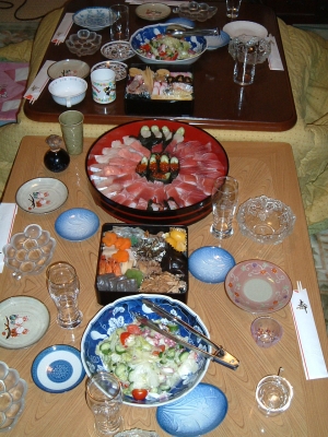 控え室の様子です。奧に映っているのは「紅白歌合戦」。もう何年もまともに見ていません。この後11時半頃に御本殿に移動して御祈祷になります。今年の初祈祷の数は900人弱。例年1300人程なのでかなり少ないです。昨今のご時世で沢山の御祈祷数はあるかと思いましたが意外です。尚マナー上、写真は撮っていません。新年明けて0時半頃に御神札等、受け取り地元の氏神様にも参拝を済ませて家に着くのは5時頃。それから5時間程、睡眠をとり年賀状を見てから今晩の用意です。毎年、元旦の夜は僕の母や兄弟を招いて新年会です。振る舞うのは毎年、「おせち料理」に「お寿司」、「お雑煮」、「サラダ」等。お酒は「プレ・モル」、「景虎」、「焼酎」等です。