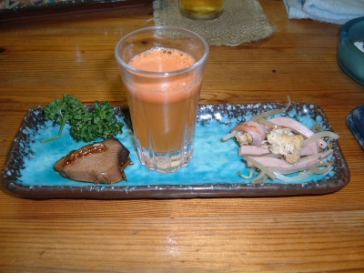 お通しです。真ん中にあるのは「ととや名物にんじんジュース」。必ず出ます!なぜ「にんじんジュース」なのか又、聞くの忘れました。