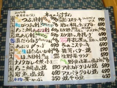 山形の地酒「上喜元」。僕好みの酒です。これだけでイケル酒です。今日はこのお酒を2合、飲みました。実は地酒のメニューはなく、いつもママさんに入っている旬の地酒を聞いて頼みます。このママさん実は今、話題の土佐出身で相当の酒豪だそうです。だからすごく地酒に詳しい!