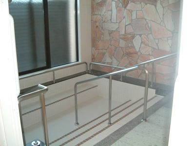 浴室です。中々、外出できないお年寄りに少しでもリラックスしてもらう為にちょっとしたリゾートバスになっています。
