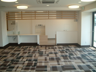 〈シーハーツ越谷〉は5階建て施設。1階は受付、浴室等。2~5階が入居部屋。写真は5階多目的ホール。