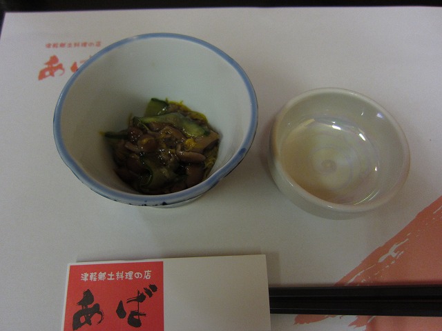 お通しです。1人ずつ店名の入った敷き紙が敷いてあります。これだけで上品に感じます。