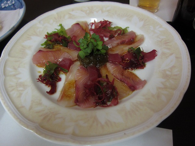 「海鮮サラダ」とメニューに明記されていますがもはや鮪のカルパッチョ。ここは女性が好みそうな肴が沢山あります!