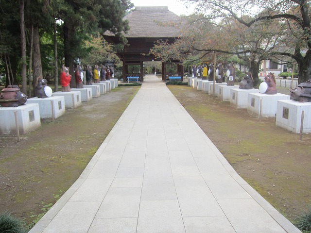 「総門」から「山門」を見た所です。参道には20体程の狸の像があります。