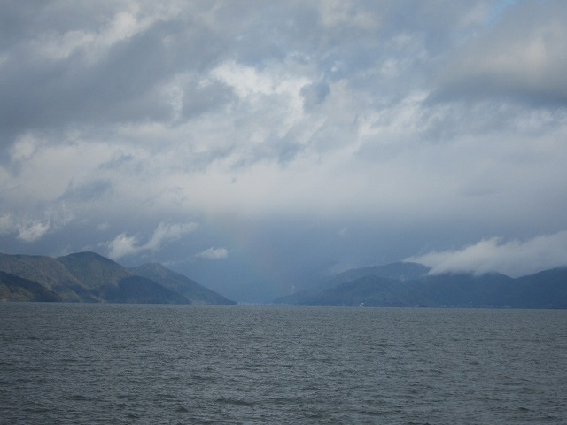 船から見た奧琵琶湖方面。うっすらと虹が架かっているのが分かります?神秘的です。これから向かう「神の島」。否が応でも気分が盛り上がります。