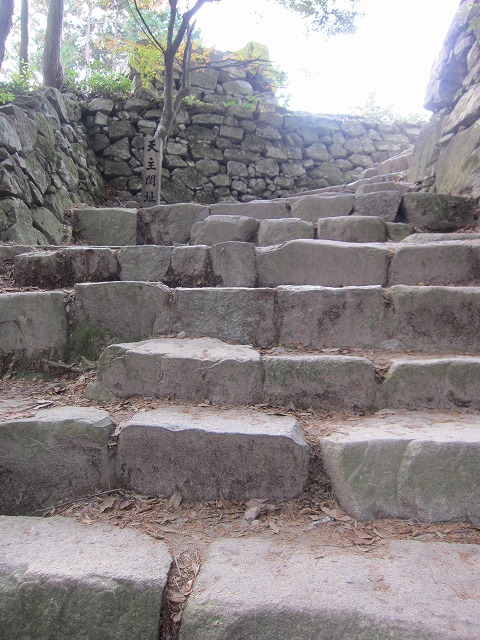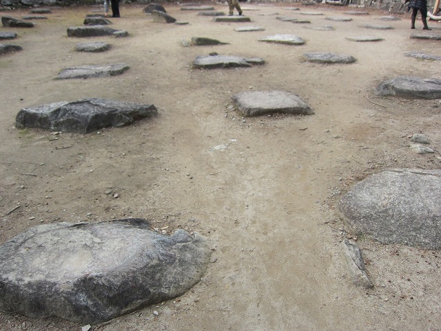 ここが「天主閣跡」です。周りを石垣で囲まれた28m四方の台地に礎石が整然と並んでいます。実際に見ると意外に狭い印象ですがここは天主の地下があった部分です。「天主」(地上6階・地下1階 高さ33m)は石垣の上から始まるので城が現存していればかなり大きかったはずです。