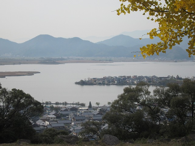 「天主」の石垣上から琵琶湖方面を望みました。当時は真下まで琵琶湖があったそうです。現在は干拓により田地になっています。しかし「信長」公もこの山々と湖をここ(約30m上)から見ていたかと思うと再度、感動です。