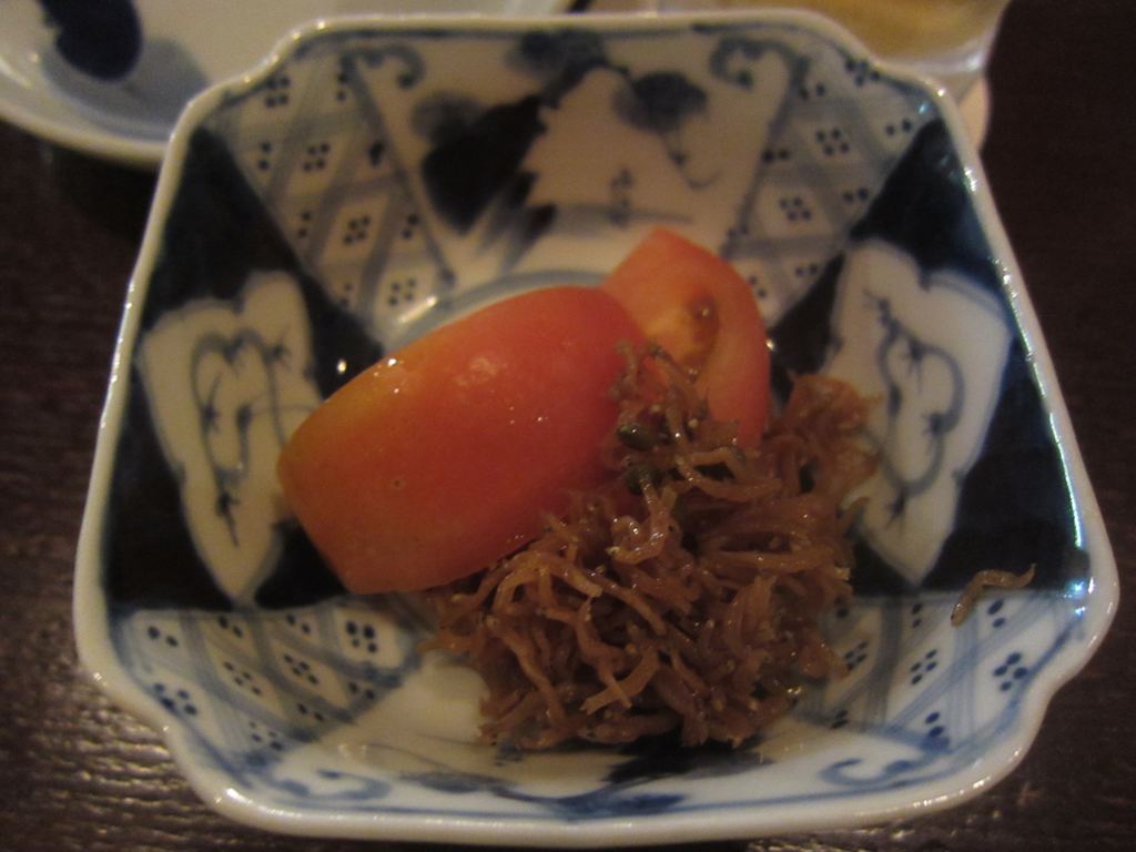 付け出しは「トマトとじゃこの山椒付け」トマトと山椒が合うのは新しい発見でした。