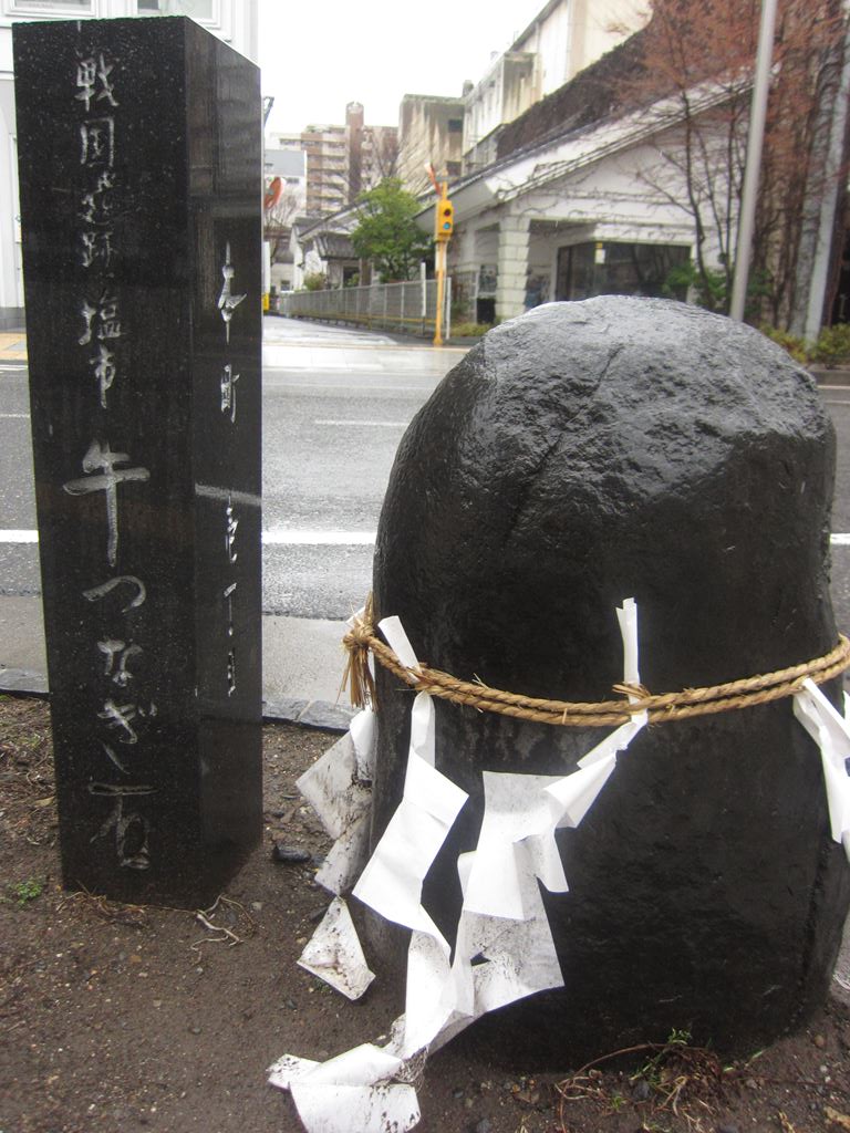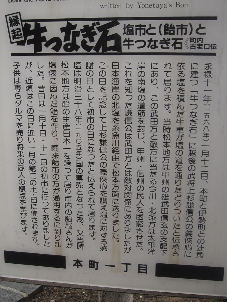まず城下に入るのに野麦峠方面から野麦街道を歩き善光寺街道にぶつかった所にあるのが「牛つなぎ石」。「謙信」公からの塩を運んだ牛をつないだという伝承がこの地には残っています。