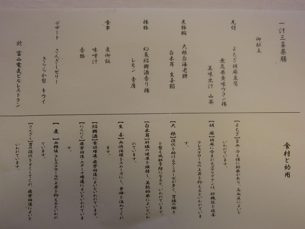 料理は「富山やくぜん」として認定されている「一汁三菜薬膳」。富山県は「富山のくすり」として有名ですが今回は市内に幾つもある「富山やくぜん認定店」の中からここを選びました。