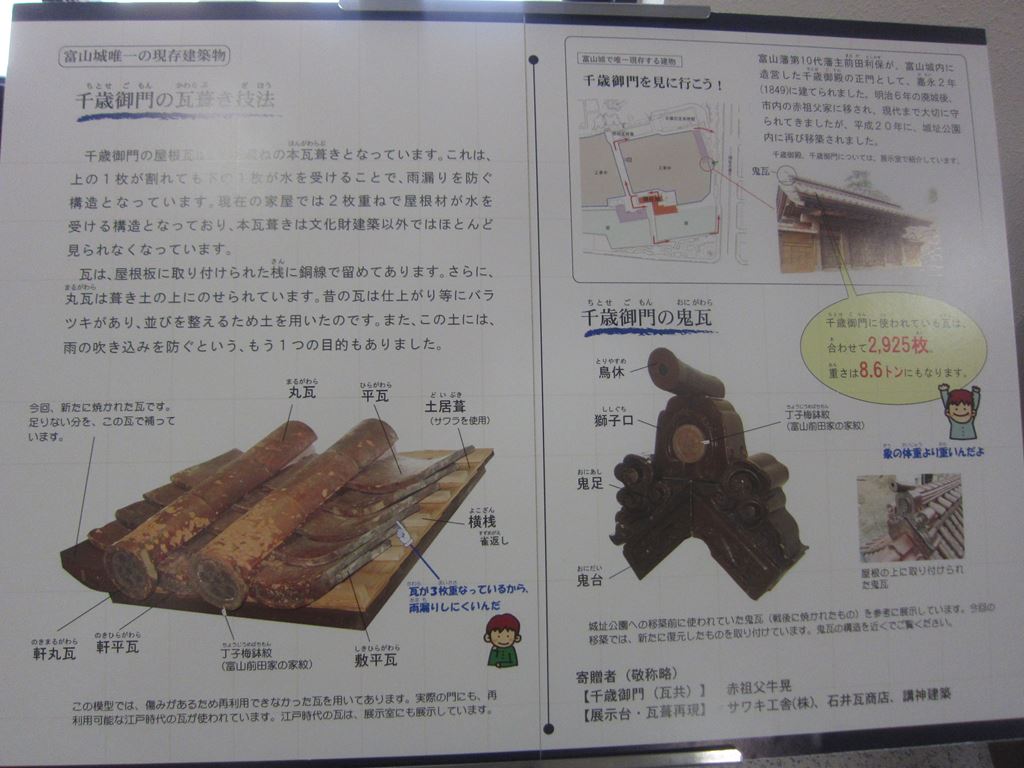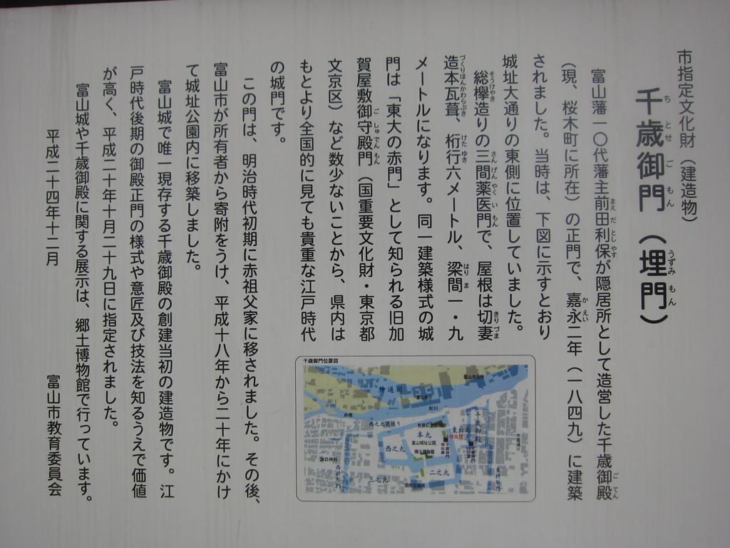 現在、「富山城」東側にある「千歳御門」はかつての「千歳御殿」の正門。「富山城」唯一の現存建築遺構だそうです。