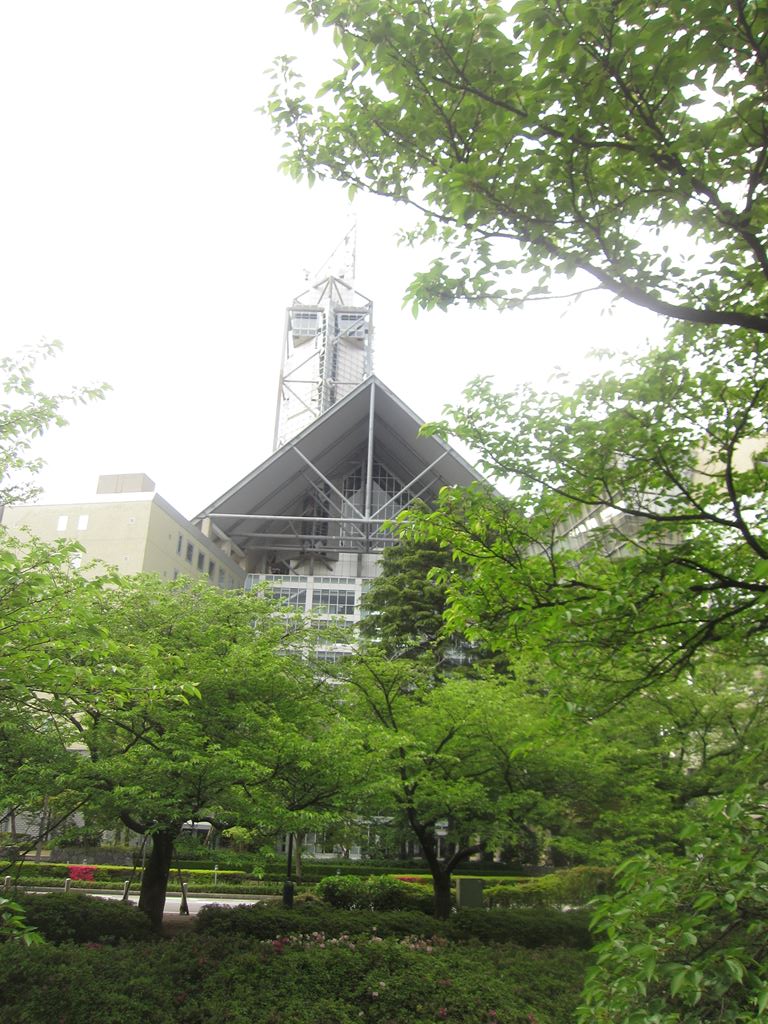 「千歳御殿」の北側にはかつて自然の防御として「神通川」が、現在は「松川」が流れています。その向こうに見えるのが「富山市役所展望塔」です。