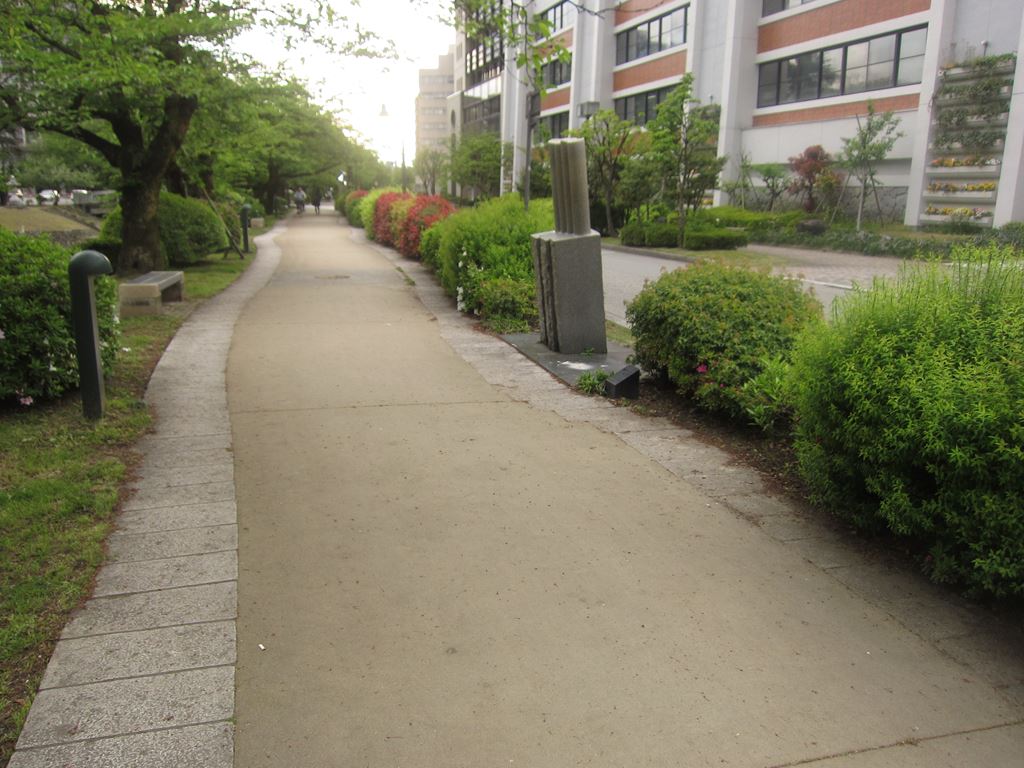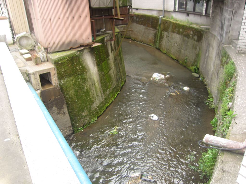 写真の中央の細い水路は、かつての「西の丸後通り」に向って流れています。古地図を見てもこの水路は確認できるので当時のままの姿かと思われます。