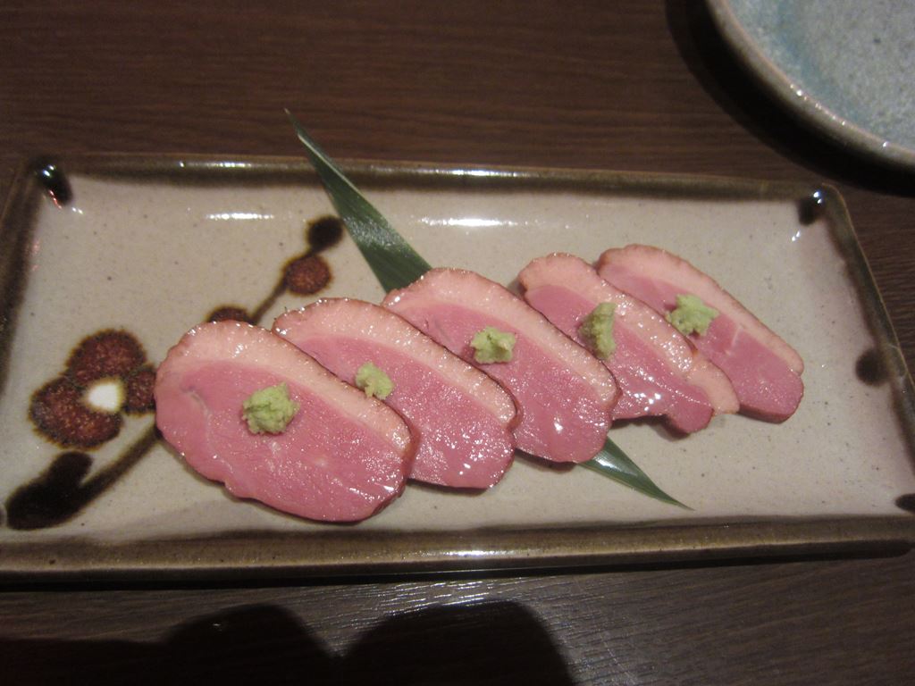 新横浜はオフィス街だけに土曜の夜は混まないのかお客はまだ僕達だけ。だからなのかレスポンス良くビールに1,2口付けただけですぐに相性の良い物が出てきました「鴨わさび」