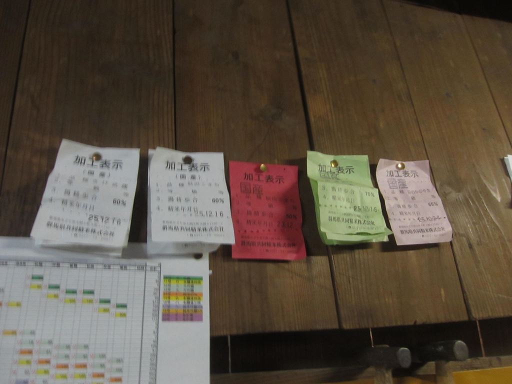 思ったよりも普通の米よりも小さい。酒は精米歩合の割合が高い為、雑味を削ぐ分、小さくなるそうです。加工表示と書かれた紙にはそれぞれの精米歩合が書かれている。