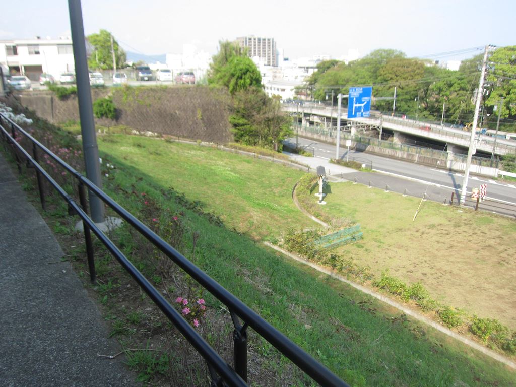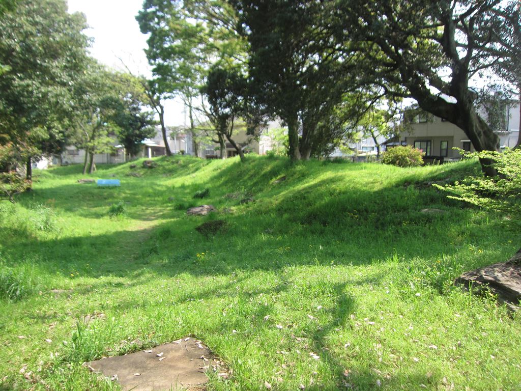 「三の丸外郭新堀土塁」頂上から「空堀」(現在は住宅地)を望む。ここも「総構」の遺構。