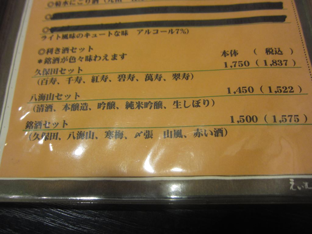 さてこの居酒屋の目玉は新潟地酒のみを「利き酒」で提供してくれる事。「久保田セット」「八海山セット」そして「銘酒セット」。それじゃお願いしてみよう。選んだのは「銘酒セット」