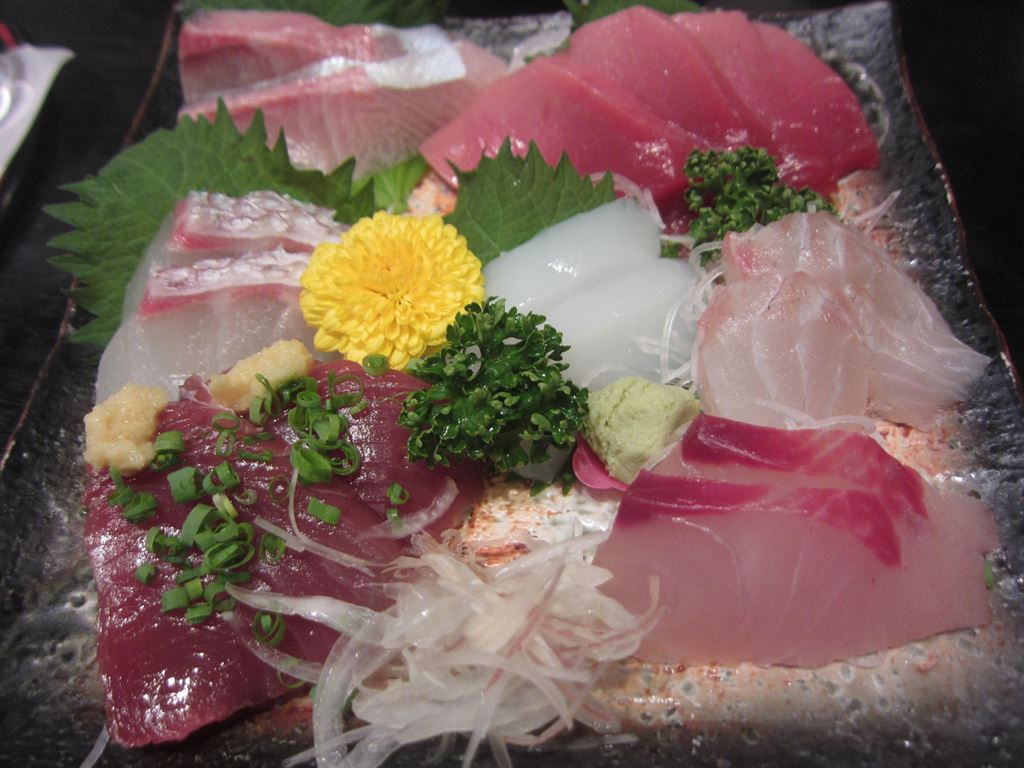 やはり刺身か!左上から「カンパチ」「マグロ」「タイ」「イカ」「スズキ」「カツオ」「ヒラマサ」