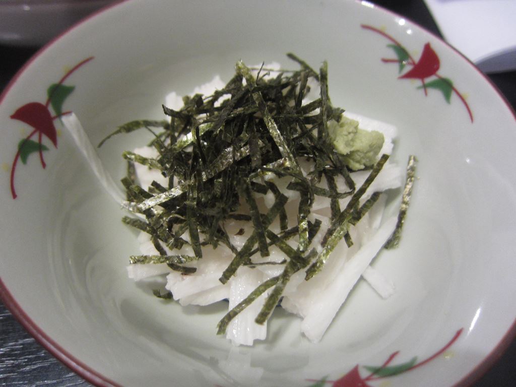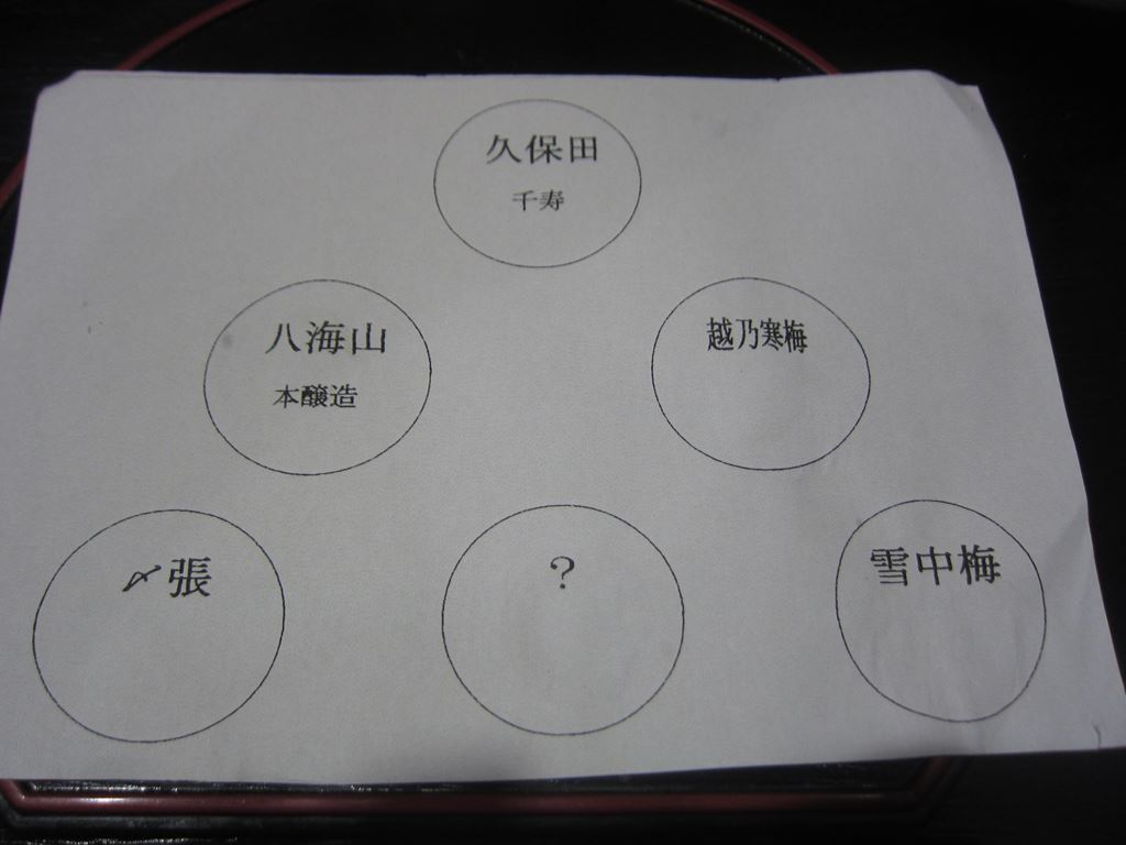 銘柄はグラスの下に明記。?は「吉乃川」。どれから行こうか迷うが1つ1つ丁寧に飲んでみる。どれもこれも、やはり新潟の酒は旨い!不味いのをさがす方が難しい。この酒達に合わせるには‥