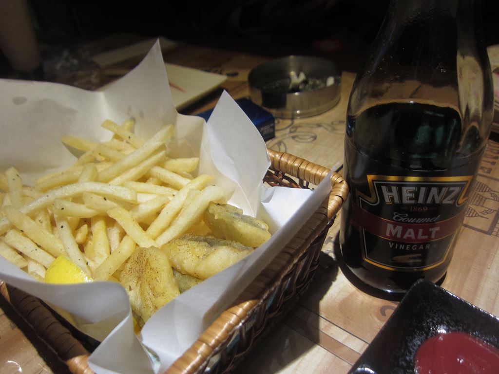 そして「フィッシュ&チップス」。前回も頂いたがここのは旨い。横にあるモルトビネガーを少し垂らすと格別!