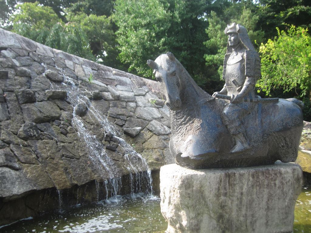 城内には「家康」公の像が多く建っている。写真は若き「元康」公(家康公)の騎馬像。「日光東照宮」の方角を向いている。