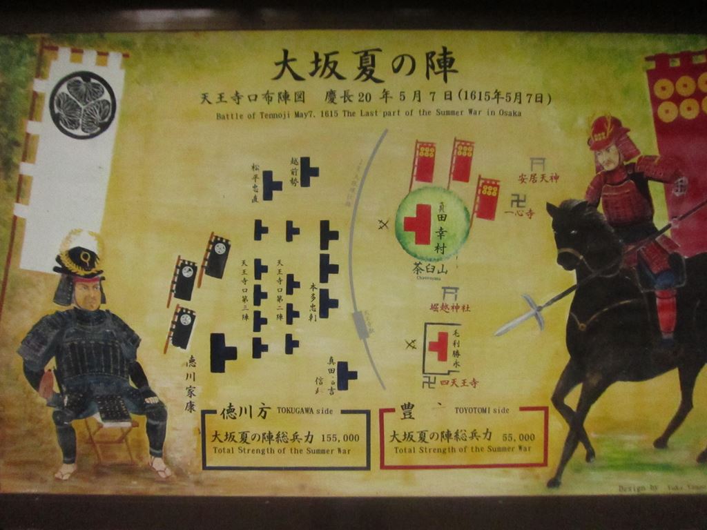 「幸村」公ら「大坂方」はこの辺り天王寺付近を決戦の場と定めて「徳川方」を引き付けた。序盤は「大坂方」が優位に戦いを進め「家康」公を追い詰めたが「徳川方」の援軍により「大坂方」は退却に追い込まれた。ここから殿を務めた「幸村」公が先の「安居神社」で休んでいるところを「徳川方」に見つかった。