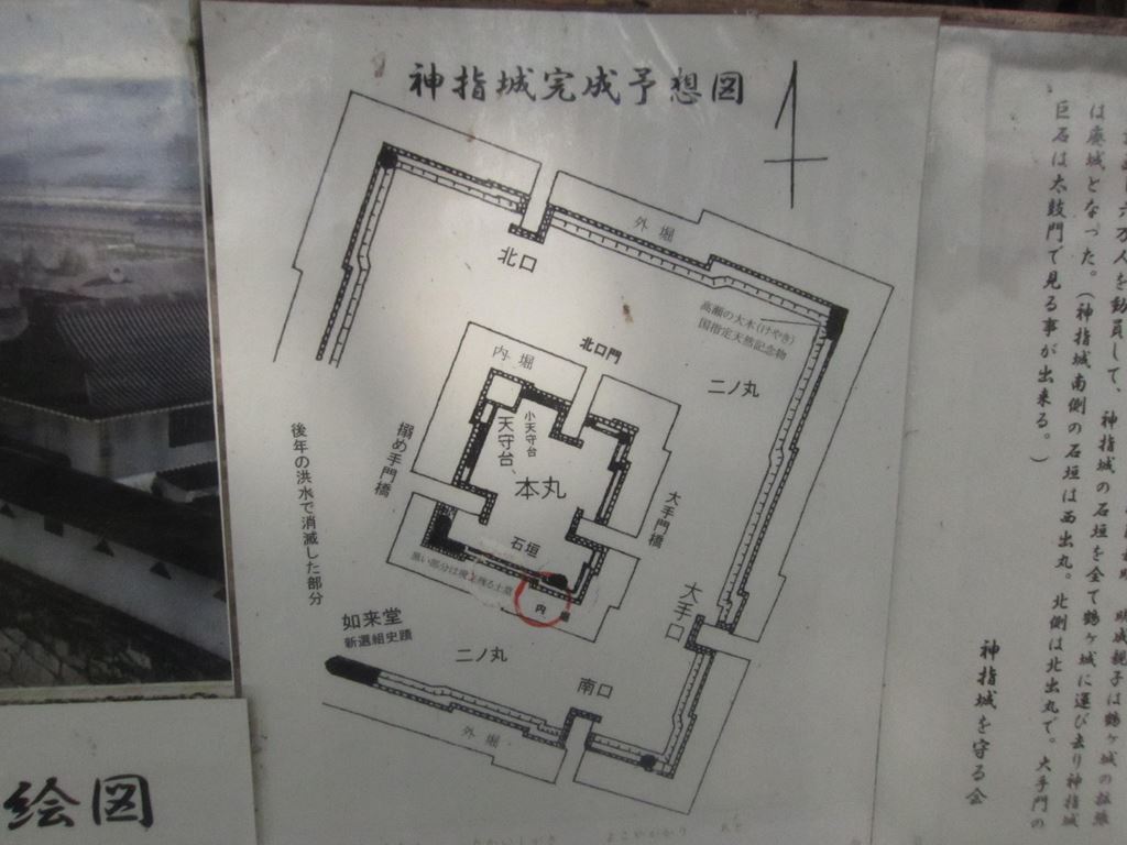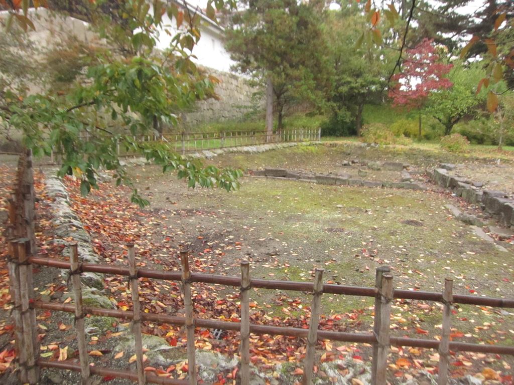 「徳川軍」の進軍により中断。「景勝」公はここを「鶴ヶ城」に変わる政治経済の中心とする構想を抱いていたようだ。「関ヶ原合戦」後、「上杉氏」が「米沢」へ移されたため未完となる。写真は「二の丸」北東隅の土塁跡。