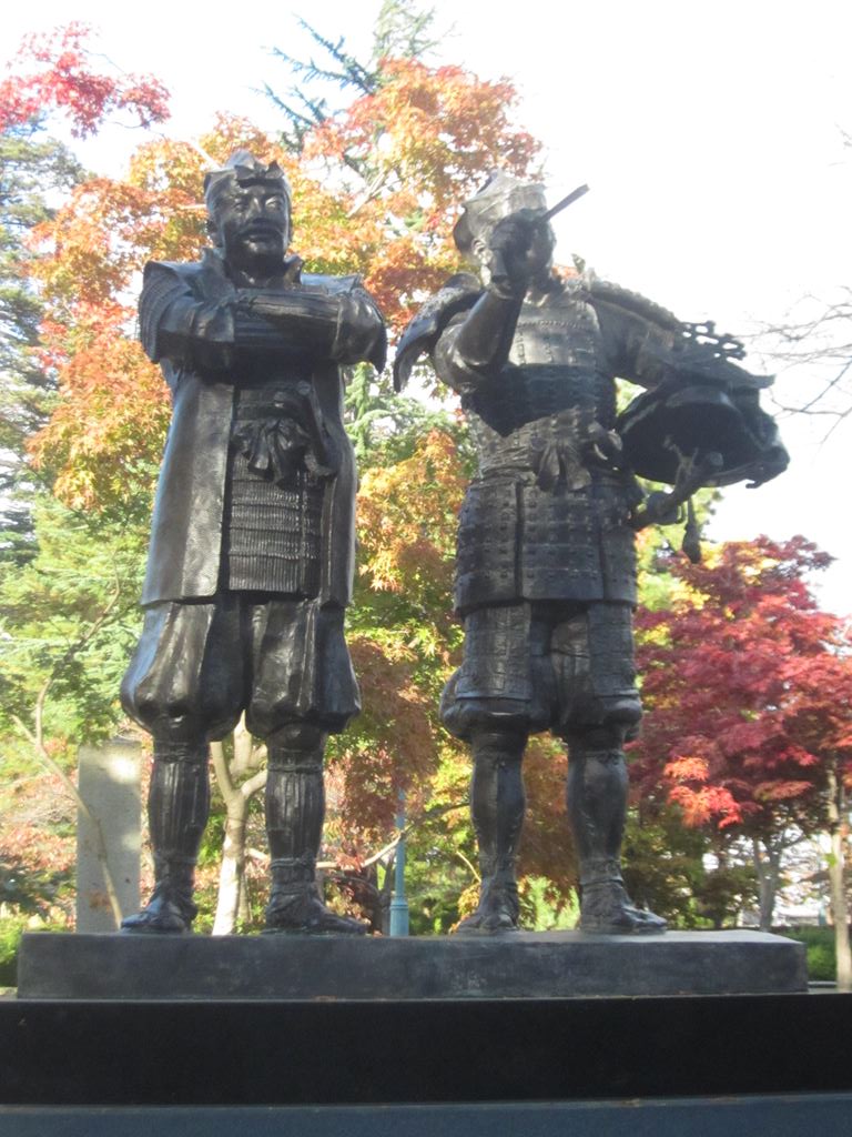 参道沿いに建つ「景勝」公と軍師「兼続」公の主従像。