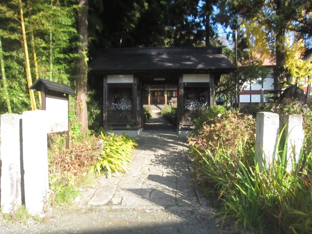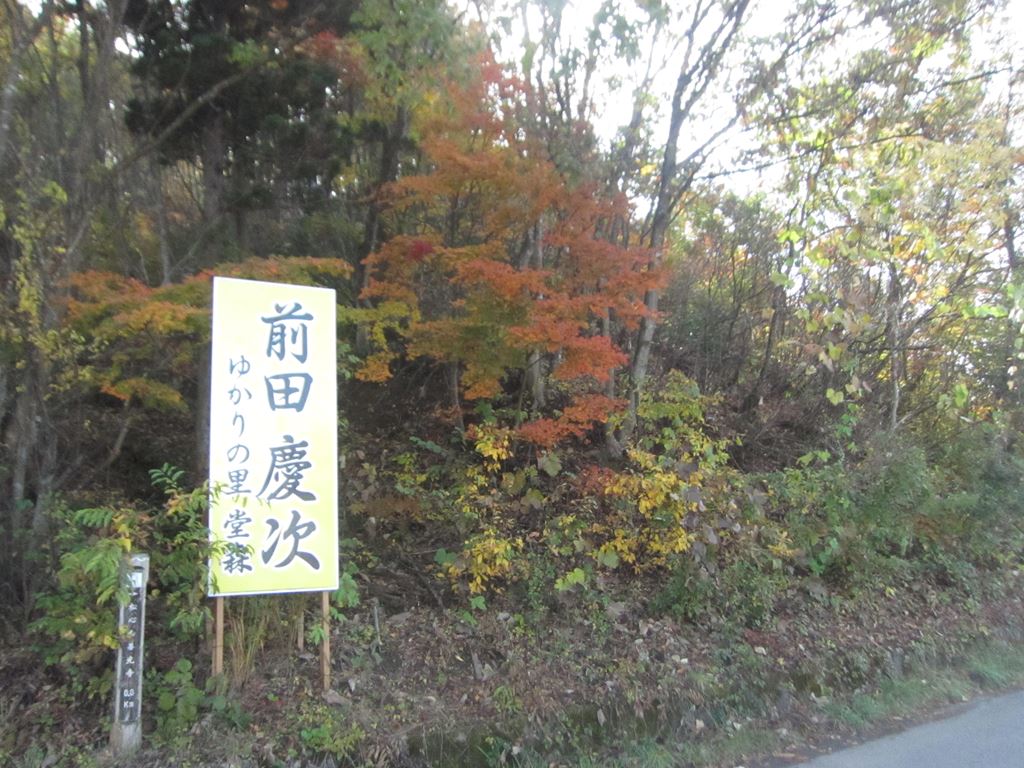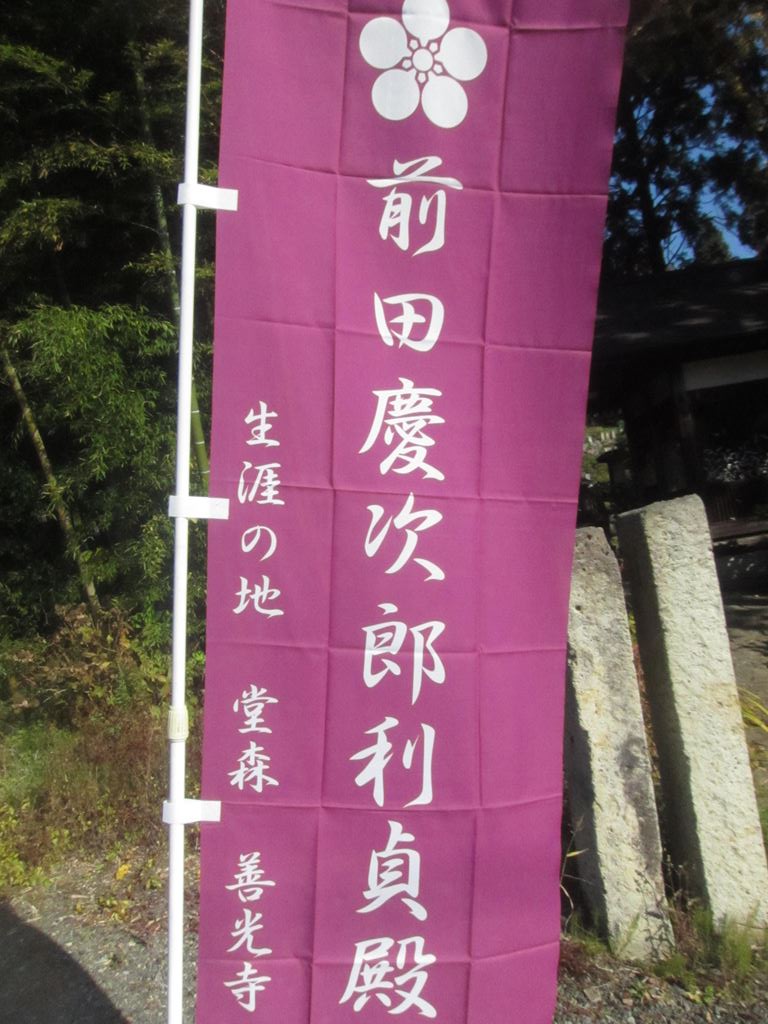 「前田慶次」ゆかりの里 堂森 の立て看板が見えるこの先に真言宗の寺院「堂森善光寺」がある。