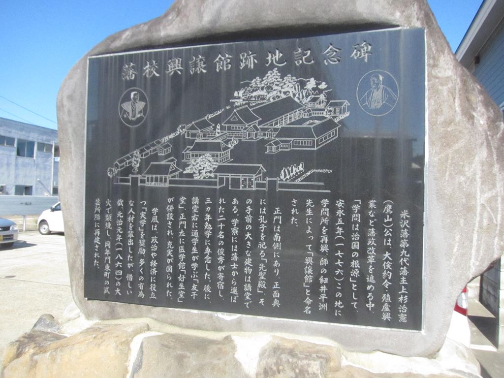 1776年に建物が完成。2008年に除幕された石碑には「興譲館」の歴史や当時の外観そして「鷹山」公と師である「細井平洲」の肖像画が刻んである。