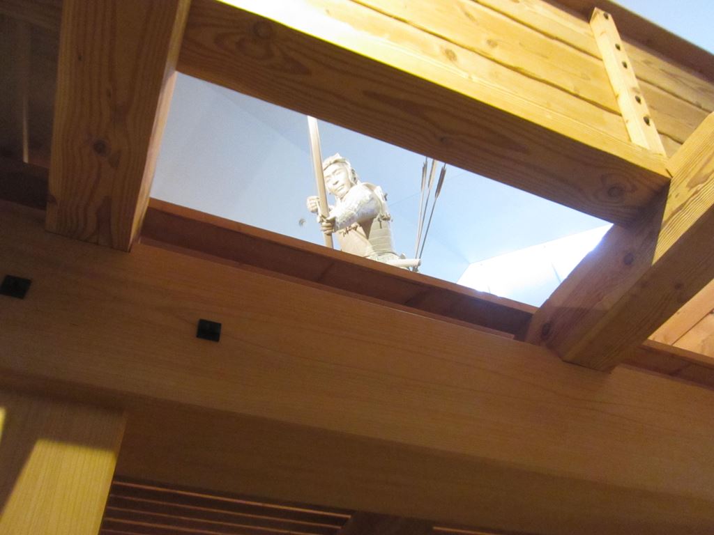 館内に再現された「櫓門」を見上げると城兵が、こちらを狙って弓を構えている。戦国時代であればここで終わり‥。