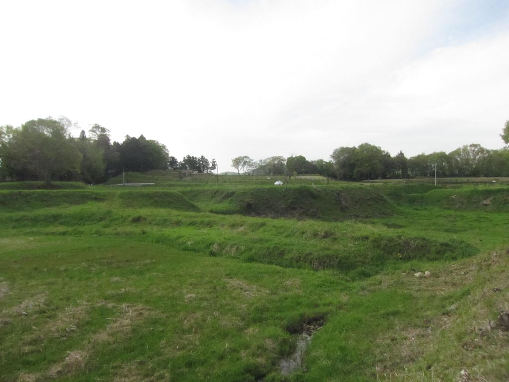 写真左下が「おくり泉水」。今は水はひいてしまっている。中央の少し盛り上がった所が「馬出」。その奥が「二の曲輪」