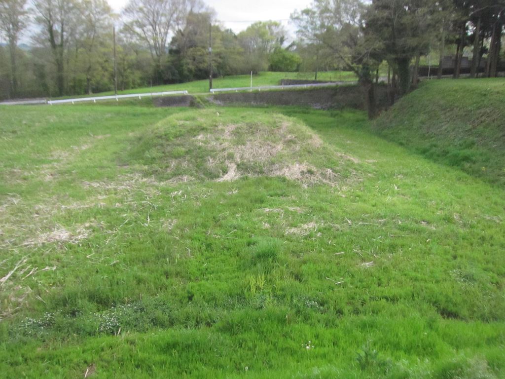 「おくり泉水」の半分を「土塁」で分けている。ここには弁天様の社があった。写真の盛り上がっている部分がそこになる。