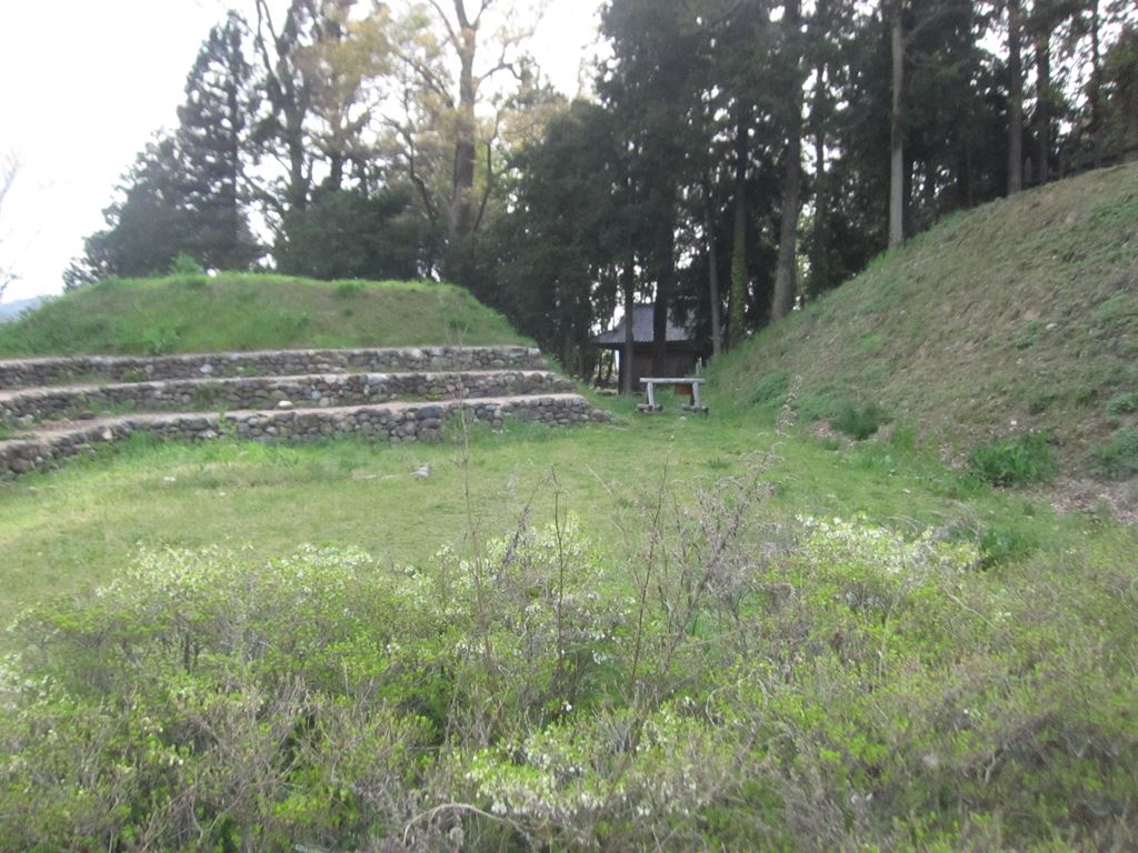 何とか「石積土塁」に登り「四脚門」「三の曲輪」内を望む。