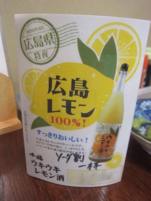 ここで酒を変えようと気になる物を一杯頂きました。呉市の酒蔵「千福」が仕込んだ「ウキウキレモン酒」。それをソーダ割りで。僕は元来、広島酒びいきなので不味いはずがありません。旨いな~。
