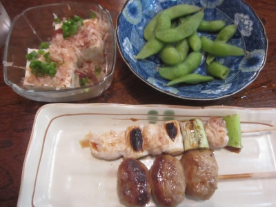 頂いたのは「晩酌セット」「一番搾り」「ねぎま」「つくね」「枝豆」「やっこ」が付いたセット。初めて入る店ではとても重宝するシステムです。