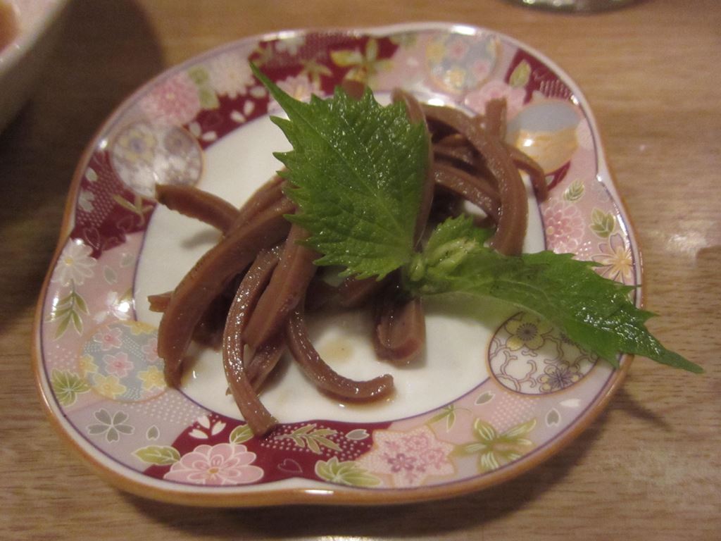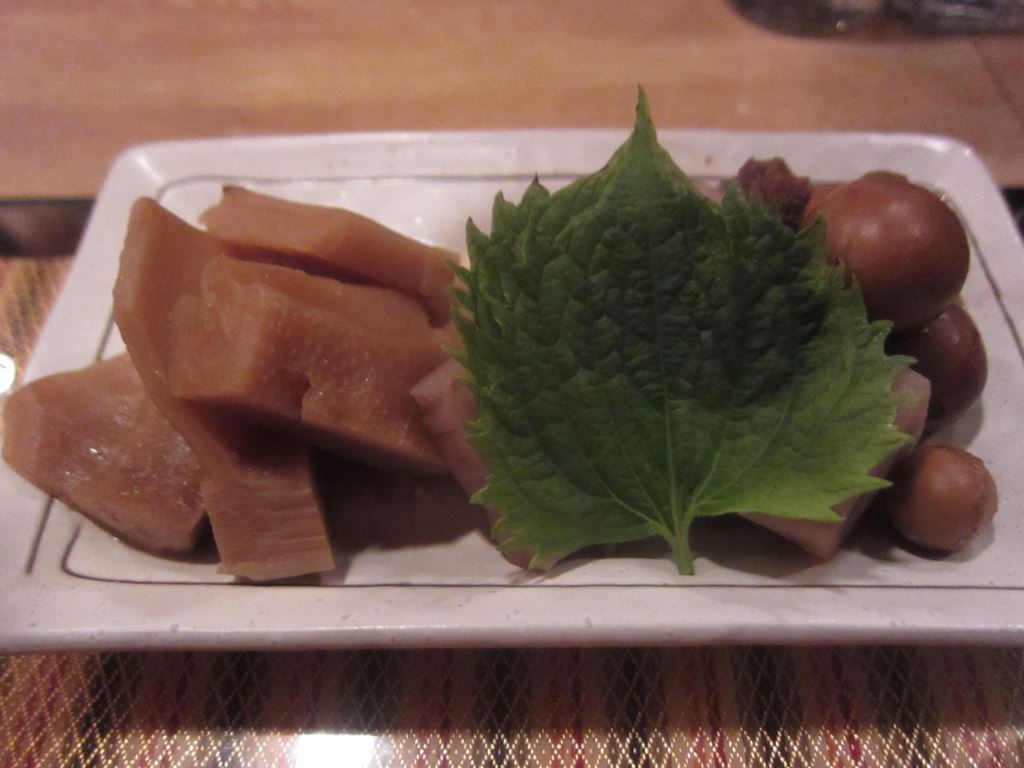 そこへ登場したのが「竹の子と鳥の卵管」。右が「卵管」。写真撮りま~すと言ったら「おかあちゃん」大葉をハラリと載せました。
