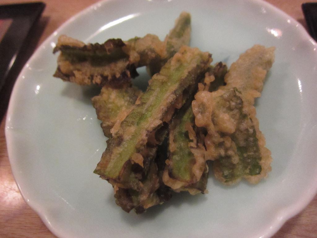 「四角豆の天ぷら」。これはくせがなくて旨い。たまらず「おとうちゃん」に地酒を相談。