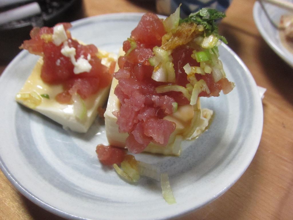 常連のやまちゃんがくれたのは「くさ笛どっこ」。豆腐の上にまぐろのタタキがのってる一品。たしか、やまちゃん豆腐は嫌いなハズだが‥まぁ良いか。せっかくのおすそわけだし。