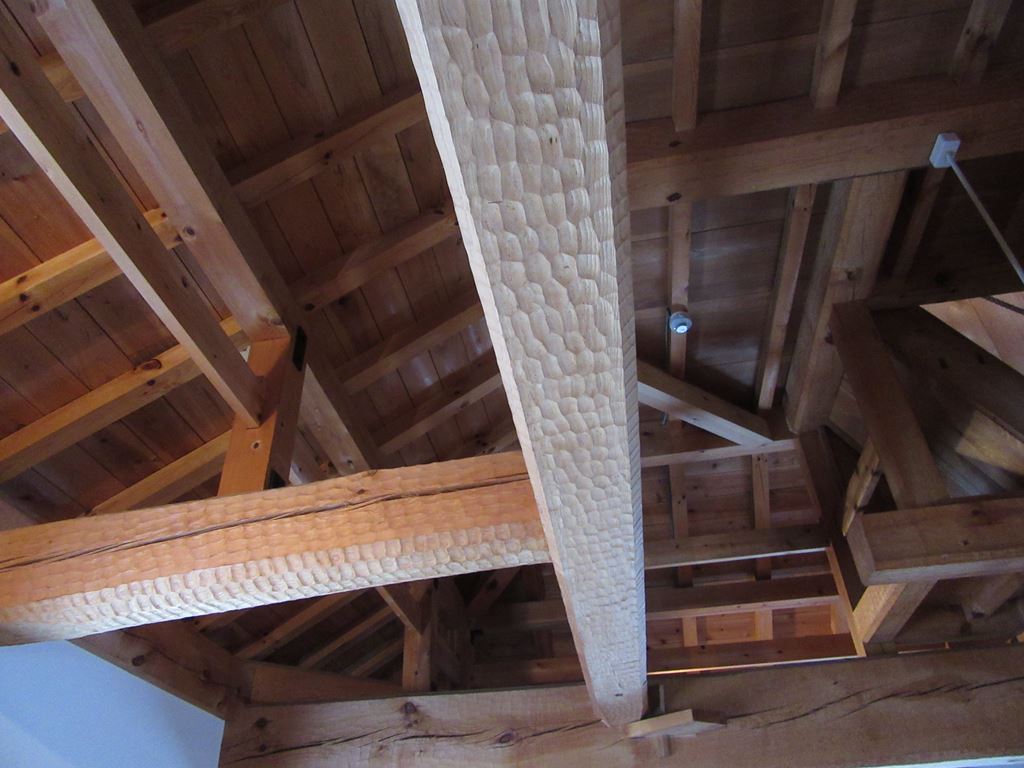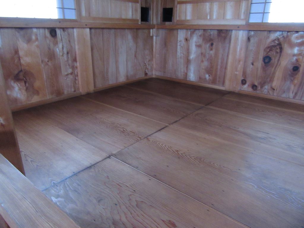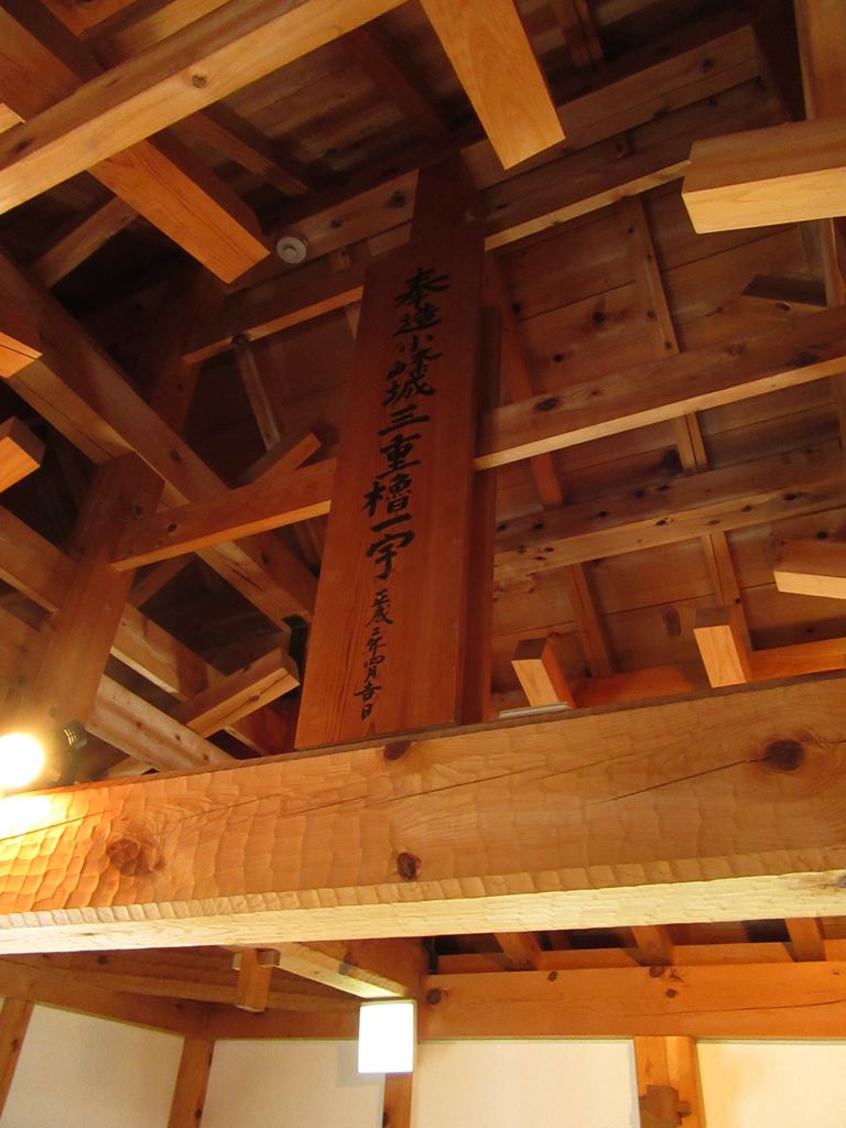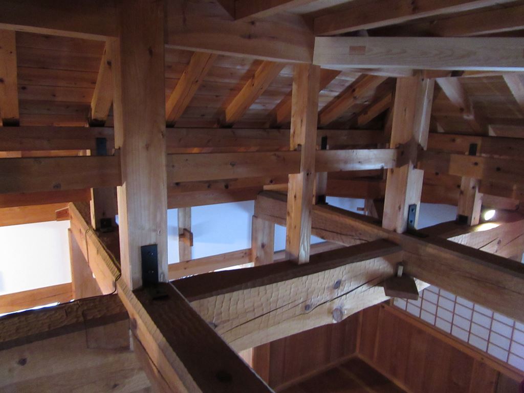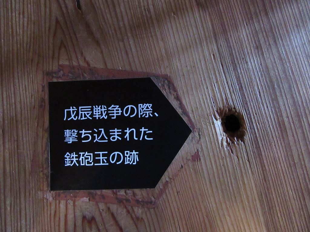 「三重櫓」を復元するにあたり戊辰戦争時の鉄砲跡が残る地元の杉を復元用材として用いている。